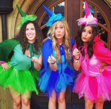 Flora, Fauna, and Merryweather bring major color-coordinated charm. Dress up in pink, blue, and green dresses with flowy sleeves and add tulle or sparkly overlays for a magical update. Top it off with fairy wings, glitter makeup, and little wands. You can go classic Disney with full gowns or modernize it into mini tulle skirts and corset tops. It’s sweet, nostalgic, and a total crowd-pleaser. Sprinkle a little fairy dust wherever you go because this trio is made for girls who love to shine with kindness and a hint of sass.