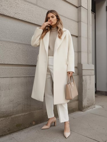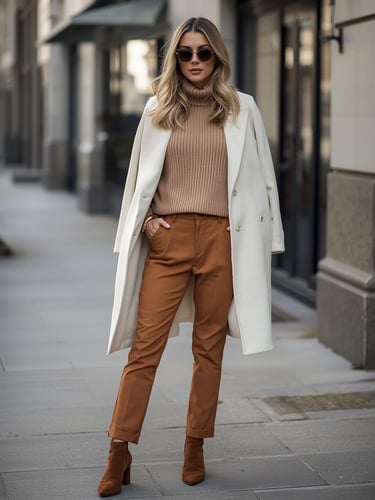 Style tip: Build your outfit with a mix of neutral materials such as knit, leather, and wool. For example, a beige knit sweater with camel trousers, suede boots, and a cream coat feels effortlessly polished and timeless.